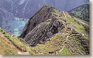 Nun stand noch der letzte Teil zum Gipfel über den Ostgrat, auf dessen Scheitel sich überraschend ein Tiefblick zum Haldensee öffnet, an. Der schmale Pfad führt zunächst hinunter in eine felsige Scharte, die mit Eisenketten gesichert ist, da es rechts senkrecht hinunter geht. Nun waren es nur noch ein paar Meter zum Gipfel. Auch hier sind einige Eisenketten zur Sicherung installiert, die man jedoch nicht unbedingt benötigt. Am Gipfel war es dann wie im Sommer im Freibad. Unzählig viele sonnten sich auf den ausgedehneten Wiesenflächen. Natürlich waren auch einige Turn- und Halbschuhakrobaten darunter. Na ja. |