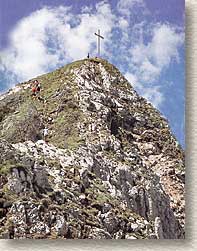 Hier biegt der Weg nun nach rechts auf den Gamsbocksteig ab. Vor mir der Blick auf die senkrecht abfallende Nordwand der Krinnenspitze im Hintergrund die Tannheimer Felsklötze Rote Flüh, Gimpel, Kellenspitze und Gehrenspitze, wandere ich in Serpentinen bis zum Wiesensattel, der sogenannten Kelle (1786 m). Beeindruckend wie sich plötzlich die Aussicht nach Süden und die Oberstdorfer Berge auftut. Ansteigend über die begraste Südseite sah ich dann nach wenigen Minuten schon das Gipfelkreuz. |